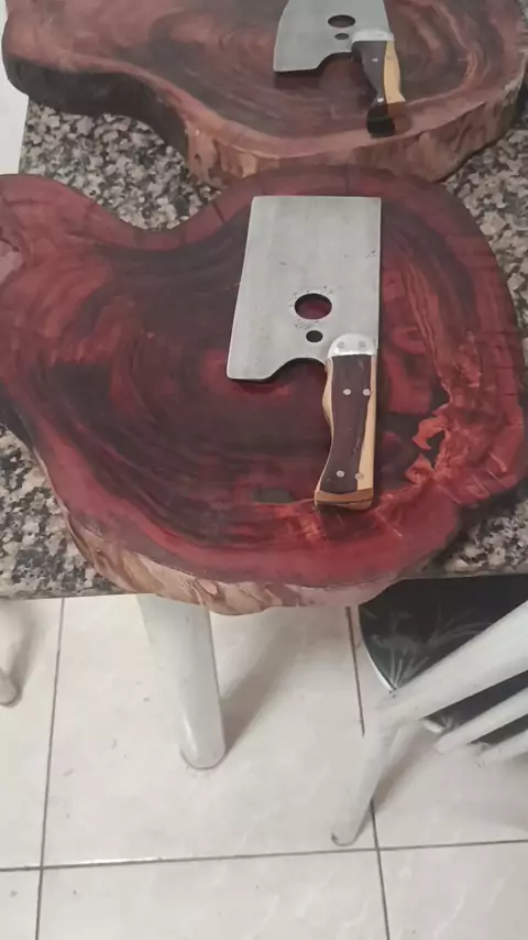 peças finalizada cotelo em cabo de jacarandá violeta e tábua para churrasco angico preto peças exclusivas