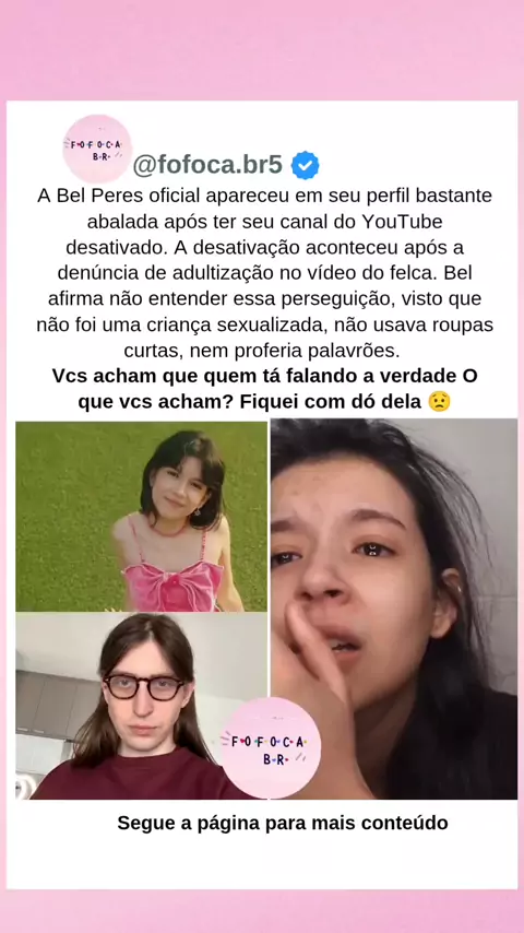 A Bel Peres oficial apareceu em seu perfil bastante abalada após ter seu canal do YouTube desativado. A desativação aconteceu após a denúncia de adultização no vídeo do felca. Bel afirma não entender essa perseguição, visto que não foi uma criança sexualizada, não usava roupas curtas, nem proferia palavrões. Vcs acham que quem tá falando a verdade O que vcs acham? Fiquei com dó dela 😟 . . . #famosos #fofoca #polemica #foryou #viraliza