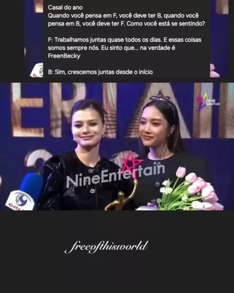 Casal do ano Quando você pensa em F, você deve ter B, quando você pensa em B, você deve ter F. Como você está se sentindo? F: Trabalhamos juntas quase todos os dias. E essas coisas somos sempre nós. Eu sinto que... na verdade é FreenBecky B: Sim, crescemos juntas desde o início