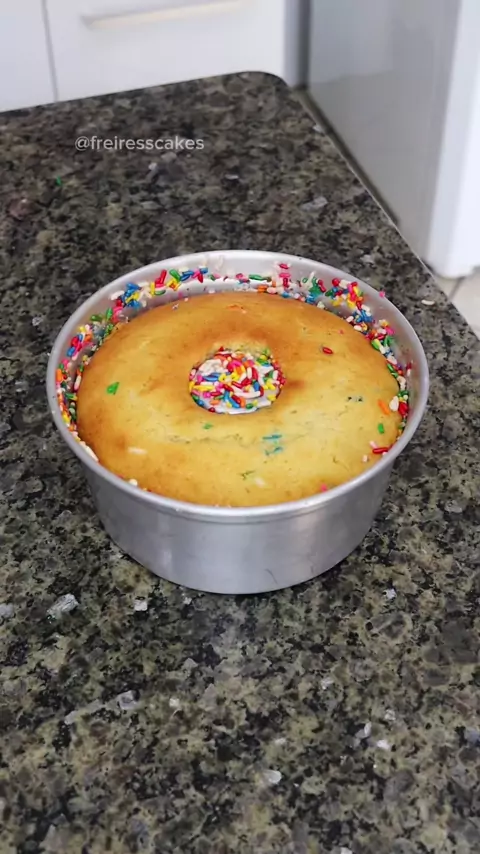 Parte 2 do bolo que já sai com granulado colorido e recheio do forno