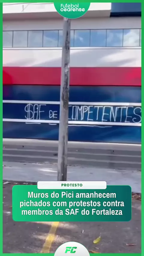 PROTESTOS! 🤯 Na manhã desta quinta-feira, 8, os muros do Centro de Excelência Alcides Santos amanheceram pichados com frases de protesto direcionadas a membros da SAF do Fortaleza, que vêm sendo alvo de críticas nos últimos meses. 🎥: Reprodução / Internet