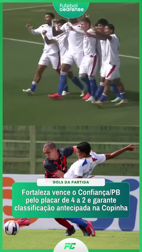 LEÃOZINHO CLASSIFICADO! 🦁 Na tarde desta quarta-feira, 7, o Fortaleza entrou em campo diante do Confiança/PB e venceu por 4 a 2, garantindo a classificação antecipada para a segunda fase da Copinha. Os gols do Tricolor de Aço foram marcados por Lucas Emanoel, Caio Wesley, Kauã Rocha e Rafael Vaz. O próximo compromisso da equipe leonina será no sábado, 10, às 15h15, diante do União Mogi, em duelo válido pela última rodada da fase de grupos. 🎥: Paulistão / 📸: Agência NaCaraDoGol