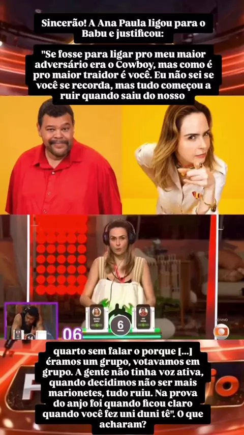 Sincerão! A Ana Paula ligou para o Babu e justificou: "Se fosse para ligar pro meu maior adversário era o Cowboy, mas como é pro maior traidor é você. Eu não sei se você se recorda, mas tudo começou a ruir quando saiu do nosso quarto sem falar o porque [...] éramos um grupo, votavamos em grupo. A gente não tinha voz ativa, quando decidimos não ser mais marionetes, tudo ruiu. Na prova do anjo foi quando ficou claro quando você fez uni duni tê". O que acharam? #apresentador #Notícia #bbbr