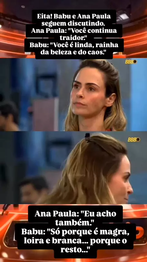 Eita! Babu e Ana Paula seguem discutindo. Ana Paula: "Você continua traidor." Babu: "Você é linda, rainha da beleza e do caos." Ana Paula: "Eu acho também." Babu: "Só porque é magra, loira e branca... porque o resto..." (📸 Reprodução: @tvglobo | @bbb) #redebbb B #bbb26