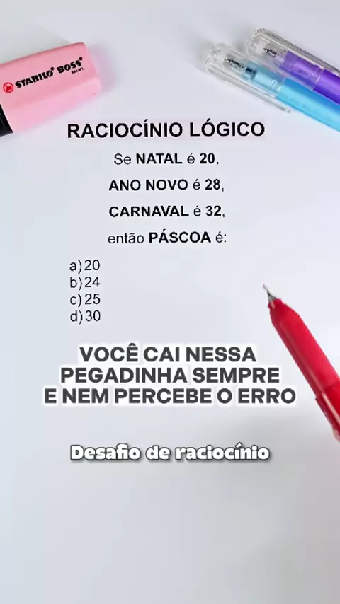 🧠 RACIOCÍNIO LÓGICO QUE DERRUBA QUEM RESPONDE NO IMPULSO! Se NATAL = 20, ANO NOVO = 28, CARNAVAL = 32, entĂŁo PÁSCOA = ? 👀 A) 20 B) 24 C) 25 D) 30 Parece uma sequĂȘncia aleatĂłria