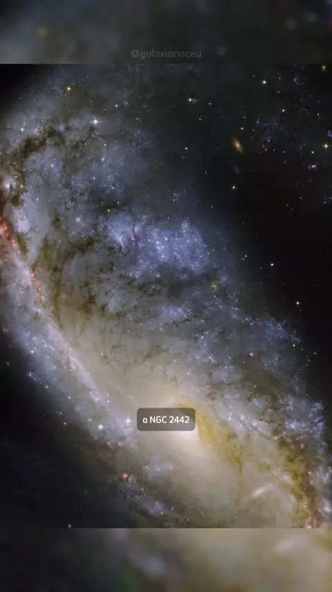 A NGC 2442 apresenta uma das formas mais incomuns entre as galáxias espirais. Sua estrutura aparece dramaticamente torcida: um de seus braços espirais está fortemente curvado sobre si mesmo, enquanto o outro se estende para longe do núcleo, criando uma aparência assimétrica e dinâmica. Os astrônomos acreditam que essa deformação seja resultado de interações gravitacionais com outra galáxia em algum momento do passado.