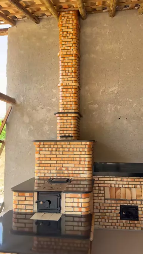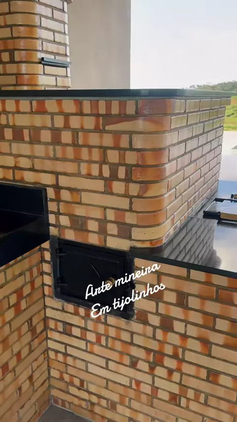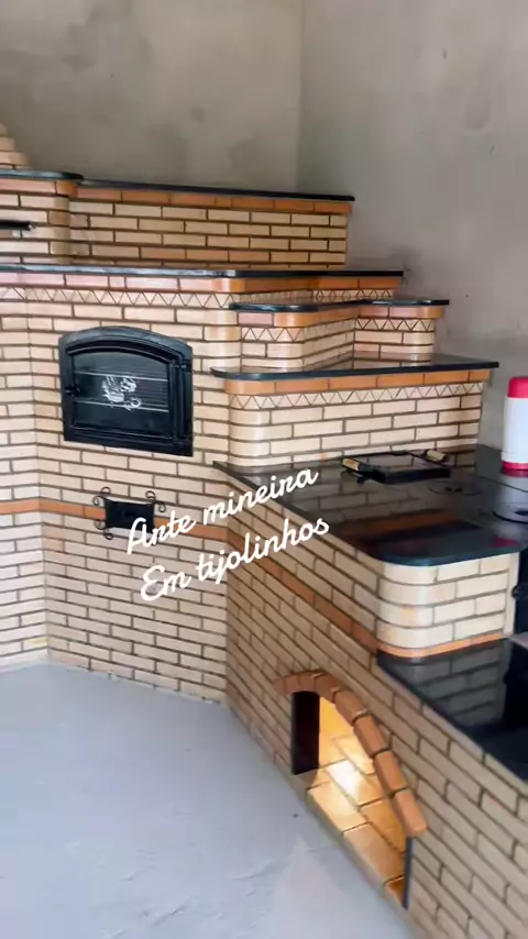 Lindo fogão a lenha com forno ,churrasqueira e bancadas em tijolinhos #fornoalenha🔥 #churrasqueira #areagourmet #granitosaogabriel