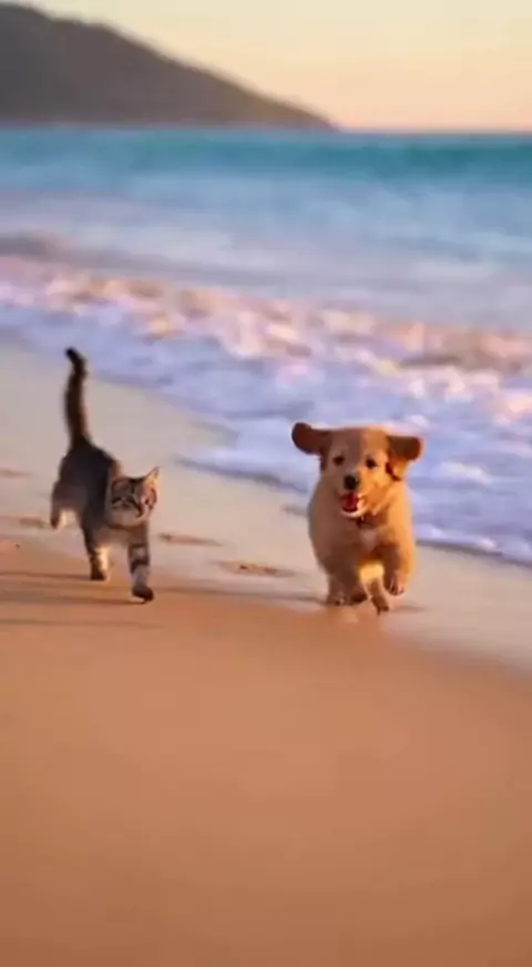 Um CACHORRINHO e um GATINHO se divertem correndo pela areia da PRAIA #gato #cachorro #dog #Praia