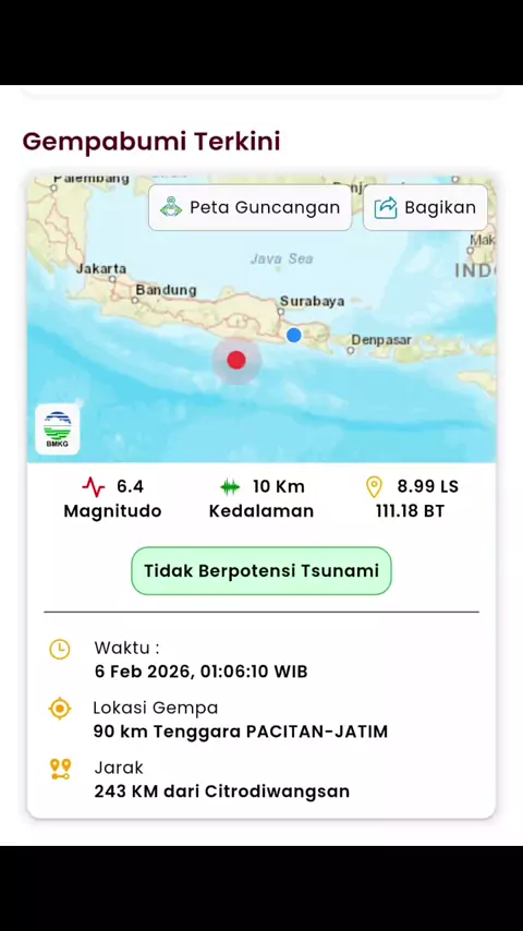 Info Gempa Mag:5.2, 24-Nov-25 03:40:21 WIB, Lok:9.35 LS,111.85 BT (141 km BaratDaya KAB-BLITAR-JATIM), Kedlmn:10 Km ::BMKG #peristiwa #bencana #bencanaalam #gempa #gempabumi