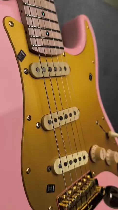 Finished this pink Strat build 🎸 The guitar finally looks complete yeeyy Bridge & tuners by @guykerofficial Link in bio#guyker#guitartok#guitargear#farabeeguitarlabs#strat