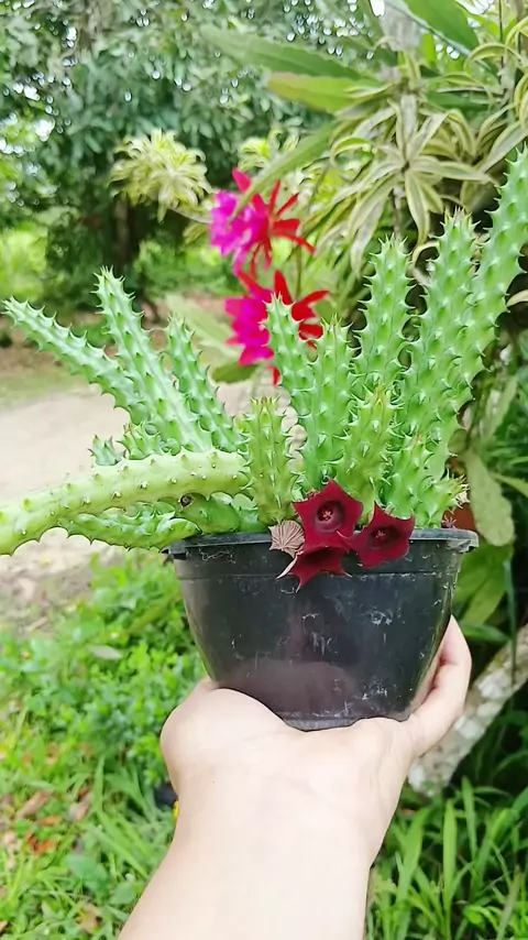 A Huernia schneideriana, ou Flor-do-Dragão-Vermelho, é uma suculenta de crescimento rastejante, com caules carnudos e espinhosos (mas macios) que formam touceiras densas, valorizada por suas flores em forma de sino, de cor vermelho-escura aveludada com centro roxo-preto, que podem ter um cheiro forte para atrair polinizadores. #huerniaschneideriana #Suculentas #jardimemcasa #minhasplantas #suculovers @Geane Correa Dantas(O150000954507054) @Telhado das Suculentas(O150001693814517)