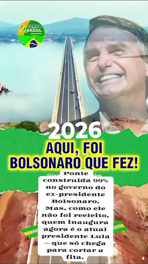 A ponte foi 99% construída no governo do ex-presidente Bolsonaro. Mas, como ele não foi reeleito, adivinha quem chega agora para cortar a fita? O presidente Lula — que levou três anos para finalizar o glorioso 1% restante. No fim, sobe no palco como se tivesse feito tudo. Mas todo mundo sabe de quem foi o mérito.