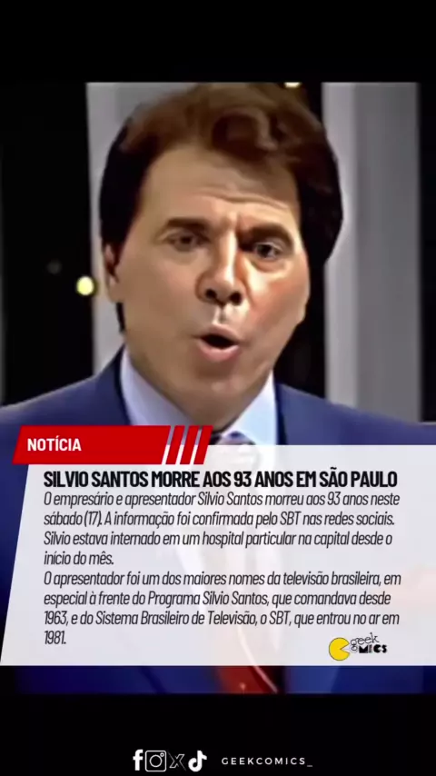 Luto na comunicação brasileira. Morreu neste sábado, 17/08 o empresário e apresentador Silvio Santos, aos 93 anos. #silviosantos #SBT #notícias