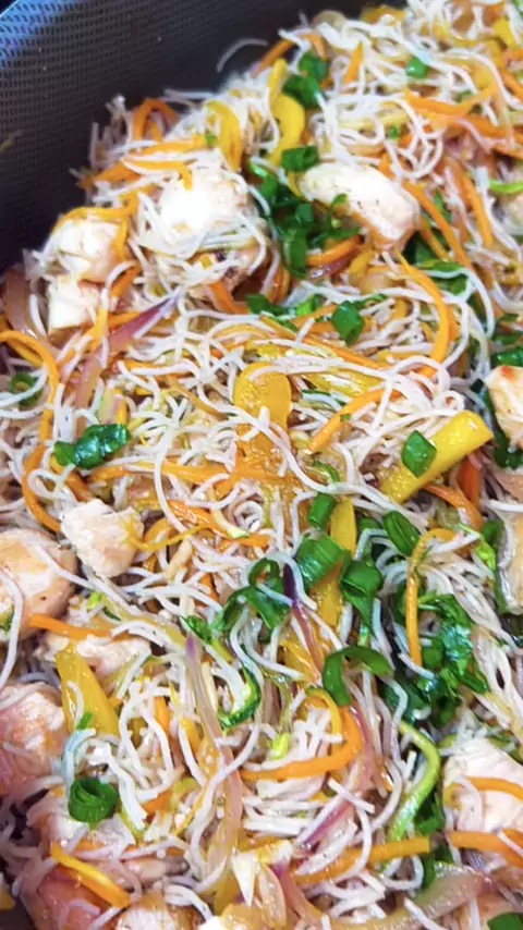 Macarrão de arroz com frango, abóbora e cenoura em tirinhas. #receita #comidadeverdade #almocodesimples #vlog