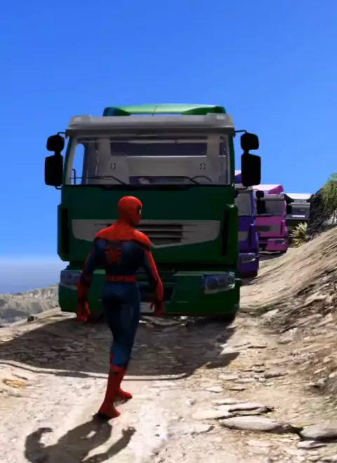 Truk besar dalam permainan melompati pergi jauh menuruni gunung.
