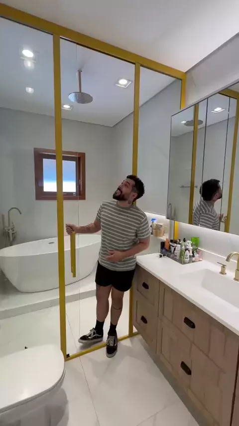 O Kaio Gonçalves deu outra cara pra esse banheiro usando GF 😮‍💨✨ Ficou com uma pegada vintage linda, elegante e cheia de personalidade. Curtiu o resultado? Comente “lambri” que te envio o link 💛