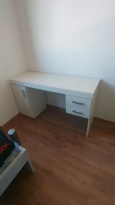 Escrivaninha com adesivo cinza escuro.