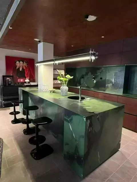 Who can refuse the avocado green rock board with its own filter? The landing effect of the customer's home is excellent: the model with flowing texture is selected, the island platform+background wall is paved, the low-key and expensive warm brown wood color+minimalist lighting, and the atmosphere of "relaxed mansion" is welded to death. The rock slab is freely customized: the size/shape/texture is fully adapted, and the face value is practical and online. #MyWeekendMemories #WholesaleFurniture