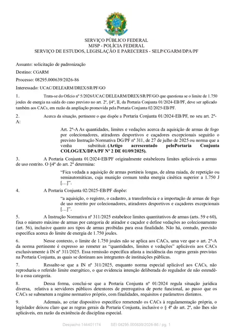 🚨 POLÍCIA FEDERAL ESCLARECE: LIMITE DE 1.750 JOULES NÃO SE APLICA AOS CACs A Polícia Federal se manifestou oficialmente e esclareceu uma dúvida que vinha gerando insegurança jurídica em todo o país: o limite de 1.750 joules de energia na saída do cano NÃO se aplica aos CACs (colecionadores, atiradores desportivos e caçadores excepcionais). O entendimento foi firmado em despacho técnico do Serviço de Estudos, Legislação e Pareceres da PF, após questionamento interno sobre a suposta ampliação d