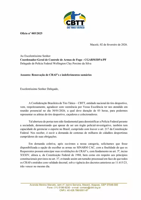 A Confederação Brasileira de Tiro Tático (CBTT) informa que, em 12 de janeiro de 2026, encaminhou ofício institucional à Chefia da DELEARM da Polícia Federal do Rio de Janeiro, relatando reclamações recebidas quanto ao excessivo lapso temporal na análise de processos de Caçadores, Atiradores e Colecionadores (CACs). As manifestações foram encaminhadas à Confederação por diversos canais oficiais, relacionadas a processos vinculados à região de Nova Iguaçu/RJ, ultrapassando o prazo de 90 dias par