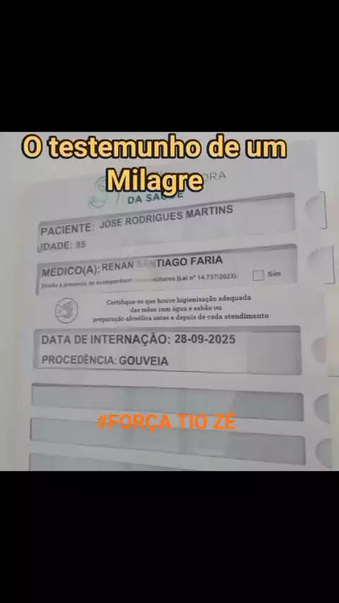 Hoje venho aqui por meio desta TESTEMUNHAR um abençoado MILAGRE na vida do nosso querido TIO ZÉ TAMEIRÃO..a mais ou menos 1 mes ele se encontra internado..e nos primeiros dias ele estava muito mal ..no CTI😥 completamente desenganado com sua situação..seu quadro estava com PNEUMONIA..INFECÇÃO.. MUITO FORTE..ÁGUA nos PULMÕES...PRESSÃO MUITO ALTA e durante algum dia SOFREU 2 PARADAS CARDÍACAS e assim com o passar com 85 anos venceu essa etapa . úm tio queridos por todos nos . Agradecemos a todos