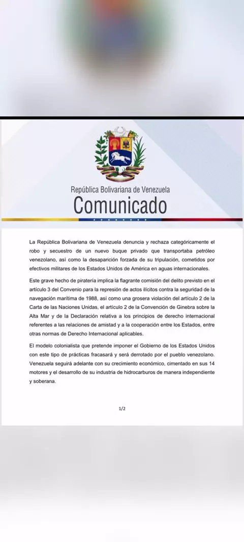 🇻🇪 La República Bolivariana de Venezuela denuncia y rechaza categóricamente el robo y secuestro de un nuevo buque privado que transportaba petróleo venezolano, cometido por efectivos militares de los EE.UU 🌍 t.me/enguerrados 💬 t.me/enguerradoschat