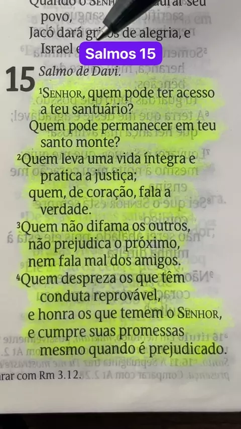 Salmos 15: 1. Senhor, quem pode ter acesso a teu santuário? Quem pode permanecer em teu santo monte? 2. Quem leva uma vida íntegra e pratica a justiça; quem, de coração, fala a verdade. 3. Quem não difama os outros, não prejudica o próximo, nem fala mal dos amigos. 4. Quem despreza os que têm conduta reprovável, e honra os que temem o Senhor, e cumpre suas promessas mesmo quando é prejudicado. #salmos #biblia #viral #Gospel #Religião
