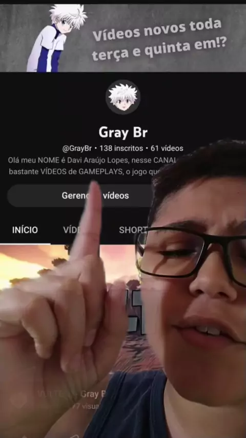 Olá, meu nome é Davi Araújo Lopes, gosto muito de fazer vídeos para internet e até tenho um canal no YouTube, ele se chama Gray Br. Espero que gostem dos vídeos que irei postar aqui e FLW!