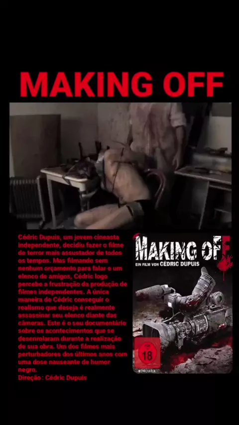 MAKING OFF Cédric Dupuis, um jovem cineasta independente, decidiu fazer o filme de terror mais assustador de todos os tempos. Mas filmando sem nenhum orçamento para falar e um elenco de amigos, Cédric logo percebe a frustração da produção de filmes independentes. A única maneira de Cédric conseguir o realismo que deseja é realmente assassinar seu elenco diante das câmeras. DIREÇÃO: Cédric Dupuis #filme #filmedeterror #foundfootage #horror #cinema