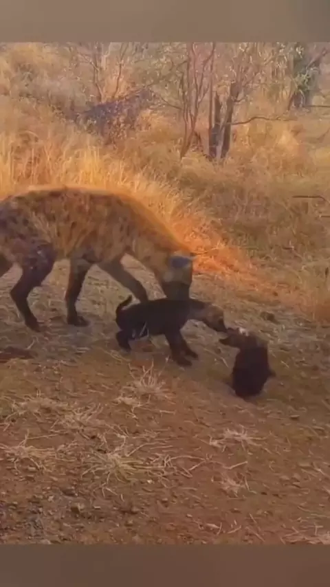 A mãe hiena não sabe o que fazer.