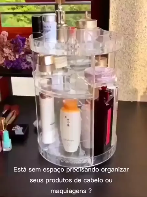 Organizador de maquiagem giratório 360° em acrílico, altura ajustável, compacto e prático. Ideal para batons, perfumes e acessórios! #maquiagem #organizador