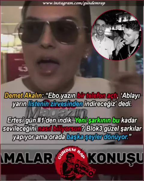 Demet Akalın: “Ebo yazın bir telefon açtı, ‘Ablayı yarın listenin zirvesinden indireceğiz’ dedi. Ertesi gün#1'den indik. Yeni şarkının bu kadar sevileceğini nasıl biliyorsun? Blok3 güzel şarkılar yapıyor ama orada başka şeyler dönüyor.”