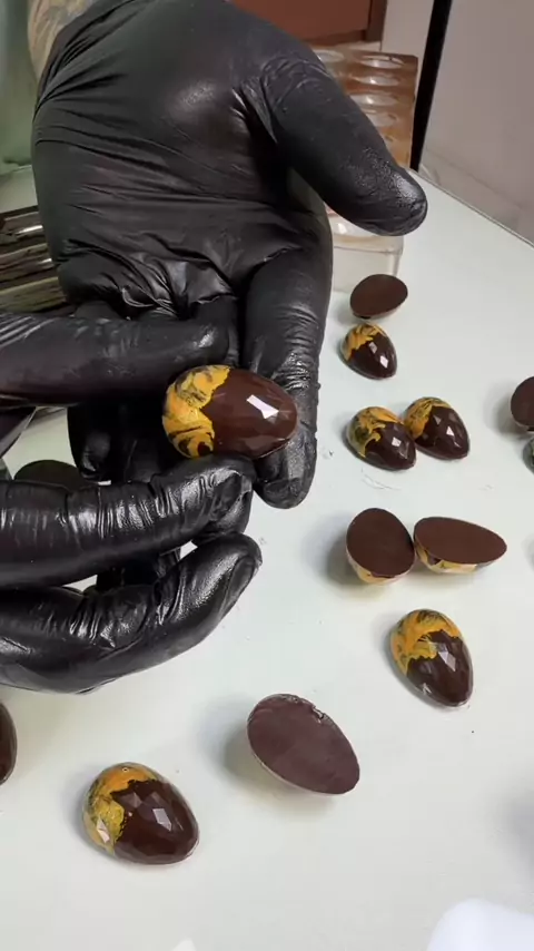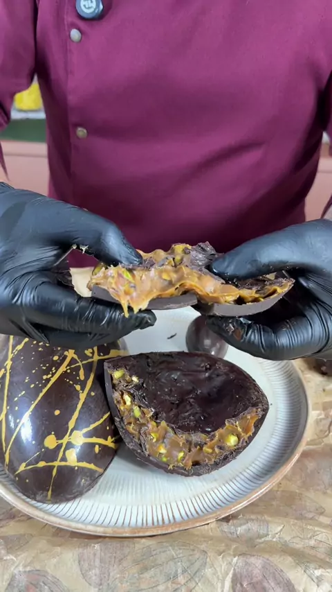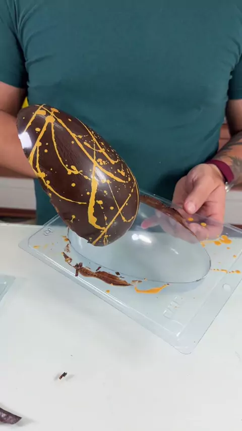 Usei o molde da @confitare CW1891 @chocolateworldantwerp ovinhos facetado para esse acabamento 🍫✨ Fiz o polimento com perflex e álcool 70 para garantir brilho, derreti a manteiga de cacau até 50°C e trabalhei entre 27 e 29°C com pó ouro, aplicando com pincel para criar esse efeito. A casca foi feita com chocolate intenso da @mastermartinibr e o recheio é uma ganache branca que eu vou mostrar melhor em breve 👀 Esse vídeo é só um pedacinho do que dá pra fazer com chocolate… Se você quer aprend