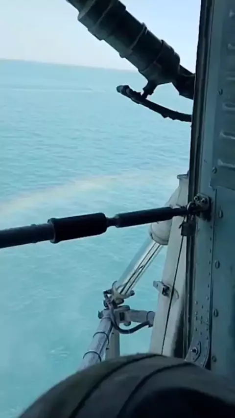 A tripulação de um helicóptero russo Ka-27 destrói um drone de superfície kamikaze nas proximidades da Crimeia com tiros de metralhadora esta manhã Como resultado de um impacto direto na ogiva do drone, sua detonação ocorreu