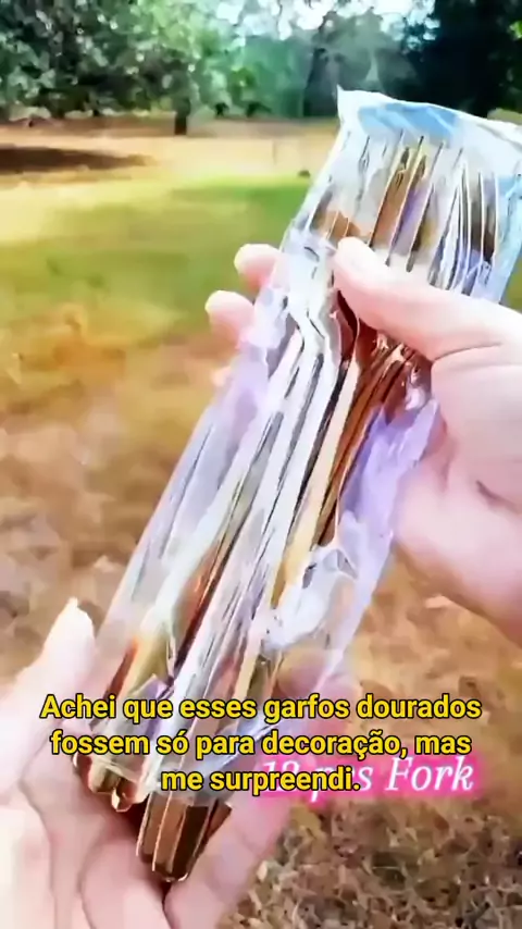 Garfo dourado que parece luxo, mas é para o dia a dia utensiliosdeluxo jantarcomestilo açoinoxidavel decoraçãodemesa festascomclasse