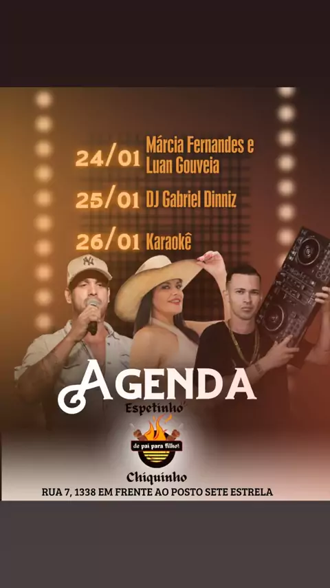 ESPETINHO DO CHIQUINHO 🍢* *APRESENTA*: *AGENDA* Dia : 24/01 MARCIA FERNANDES E LUAN GOUVEIA ( Horário 19:00h ) Dia : 25/01 DJ GABRIEL DINIZ ( Horário 17:00 ) Dia 26/01 KARAOKÊ ( Horário 16:00 ) Horário : após as 16:00h Local : doutor Celestino 1338 rua : 7 Referência : posto 7 estrela 🟢 Entrada franca ( grátis ) Você sua família e amigos sao nossos convidados : VEM PRO ESPETINHO DO CHIQUINHO 🍢🍢🍢 Faça sua reserva de mesa no whatsapp . 12982242098