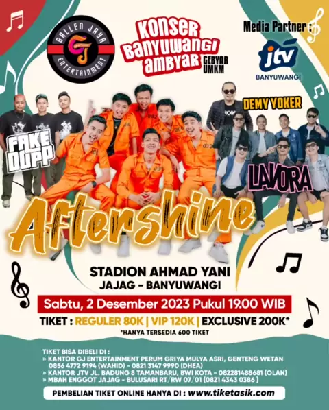 ayo rame-rame datang ke Konser Banyuwangi Ambyar dengan bintang tamu @aftershineofficial dan juga @fakedopp @lavoraofficial @demyyoker_official dapatkan segera tiketnya sekarang juga! *hubungi nomor yang tertera atau datang langsung di tempat pembelian, tiket juga bisa dibeli secara online#banyuwangi#konser#konserambyar#bwi#konserbwi#konserbanyuwangi#konserbanyuwangiambyar#ambyar#ambyarpeople#aftershine#fakedopp#lavora#゚viral#jtv#jtvbanyuwangi#jawatimur