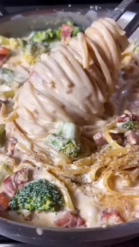 Voltando! 250gr de espaguete 150gr de bacon em cubo 2 dentes de alho picado 1/2 maço de brócolis 2 CS de cream cheese Sal e pimenta a gosto Queijo parmesão ralado a gosto