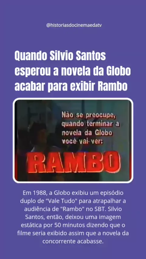 Confira como Silvio Santos desafiou a Globo em 1988 e protagonizou uma das maiores batalhas da TV brasileira com a exibição dos filmes "Rambo" e "Rambo II". Uma disputa que parou o país e mostrou a astúcia do "Homem do Baú". Leia a matéria completa no Histórias do Cinema e da TV. Link na bio ou nos stories. #rambo #silviosantos #sbt #television