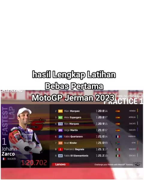 Hasil Lengkap Latihan Bebas Pertama /P1 MotoGP Jerman 2023 Johann Zarco tercepat disusul Marc Marquez Dan Alex Marquez diposisi kedua dan ketiga.. Pecco Bagnaia diposisi ke 8.. Marc Marquez Masih perkasa di Sachsenring.. 1. Johann Zarco 2 Marc Marquez 3 Aleix Espargaro 4 Alex Marquez 5 Jorge Martín 6 Fabio Quartararo 7 Brad Binder 8 Pecco Bagnaia 9 Fabio Di Giannantonio 10 Marco Bezzecchi #MotoGP #GermanGP 🇩🇪 #P1