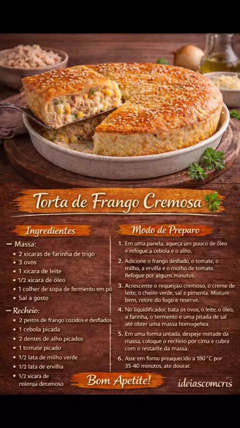 Torta de Frango Cremosa! Sabe aquela receita que agrada todo mundo? Essa torta de frango é cremosa, fácil de fazer e perfeita para o almoço ou jantar. Salve essa receita para fazer no fim de semana. Compartilhe com quem ama comida caseira. #TortaDeFrango #ReceitaCaseira #ReceitasFáceis