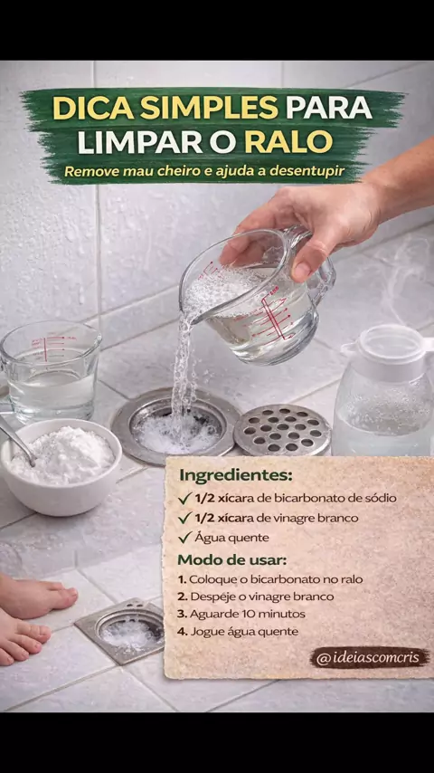 Dica simples para limpar o ralo. Chega de mau cheiro no banheiro. Misturinha fácil que ajuda muito! Salva pra usar depois. Compartilha com quem precisa dessa dica. #DicasParaCasa #LimpezaFacil #RaloLimpo