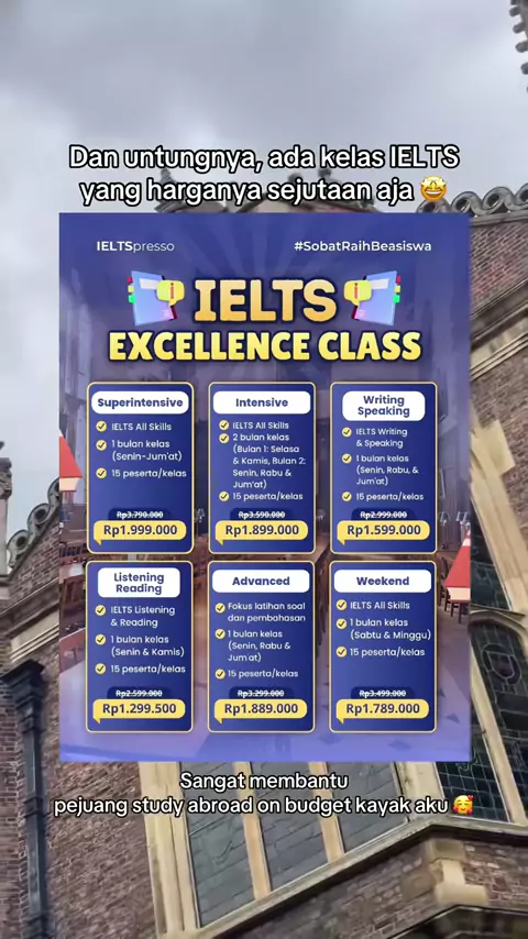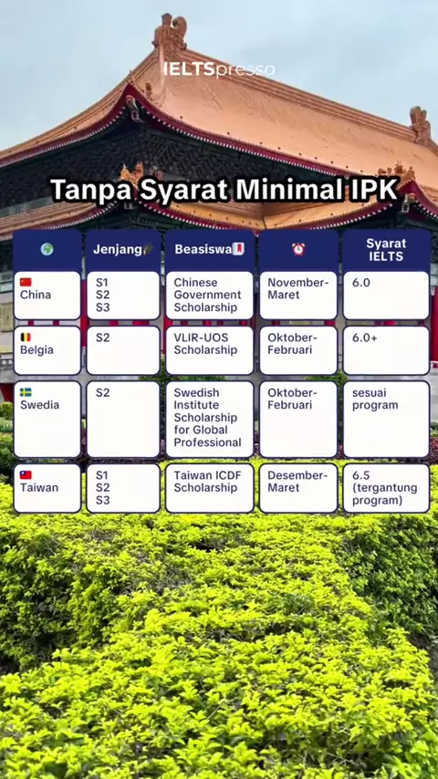 Beasiswa Tanpa Minimal IELTS Nih Bos! ๐Ÿ˜Ž Hayo yang lagi cari peluang beasiswa ke LN tanpa ada syarat minimum skor IELTS, bisa banget daftar yang ini!! Ada yang lagi buka pendaftaran juga loh~๐Ÿš€ Jangan lupa persiapan dari sekarang biar lebih maksimal yuk! ๐Ÿฅณ Mau dibimbing IELTS plus dapet FREE Scholarship Preparation bareng expert tutor? Cuss hubungi MinSo di โฉ ๐Ÿ‘‰ WA MinSo: 0851-8560-1411 (Konsultasi Program) ๐Ÿ‘‰ ieltspresso.com#BeasiswaLuarNegeri#StudyAbroad#InfoBeasiswa#KuliahdiLuarNegeri#Beasi...