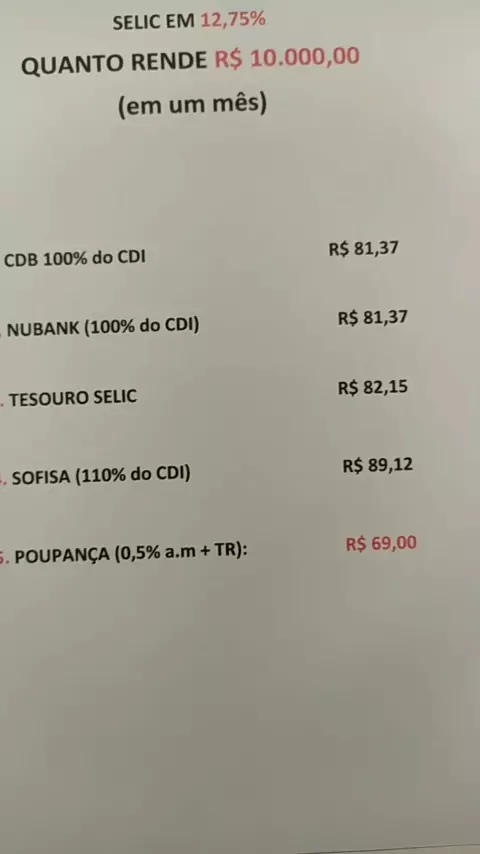 Com a nova Selic em 12,75%, esse é o valor que rende 10mil reais aplicados em um mês, nesses investimentos. Deixe aí nos comentários se achou muito ou pouco e não se esqueça de me seguir pra mais ;) #dinheiro #taxaselic #selic #rendafixa #tesouroselic