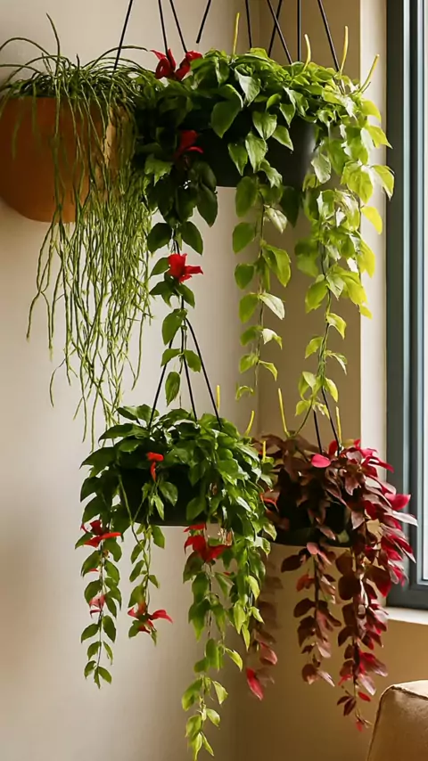 Decore sua sala com charme e leveza! 🌿 Veja 4 plantas pendentes lindas e fáceis de cuidar: cacto macarrão, columéia-batom, lambari-roxo e peperomia scandens. Dê mais vida ao seu ambiente com essas opções perfeitas para interiores! 🌸✨ #Plantas #jardim #BemEstar #decoraçao #paisagismo