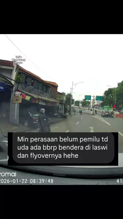 Salah seorang wargi Bandung Raya mengeluhkan keprihatinannya mengenai adanya bendera yang terpasang di median jalan Laswi, Kota Bandung hingga ke flyover, Kamis,22/01/26 pagi. "Min perasaan belum pemilu td (tapi-red) uda ada bbrp bendera di laswi dan flyovernya hehe" tulisnya melalui pesan medsos. #InfoBandungRaya #IBRjan26