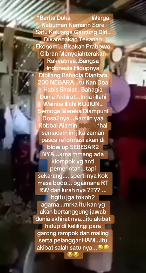 *Berita Duka Warga Kebumen Kemarin Sore Satu Keluarga Gantung Diri.. Dikarenakan Tekanan Ekonomi...Bisakah Prabowo Gibran Menyejahterakan Rakyatnya..Bangsa Indonesia Hidupnya Dibilang Bahagia Diantara 200 NEGARA..Itu Kan Doa Habis Sholat . Bahagia Dunia Akhirat...Inna lillahi Wainna illahi ROJIUN.. Semoga Mereka Diampuni Dosa2nya...Aamiin yaa Robbal Alamin 🤲🏾🤲🏾🤲🏾*hal semacam ini jika zaman pasca reformasi akan di blow up SEBESAR2 NYA...krna mmang ada klompok yg anti pemeri...