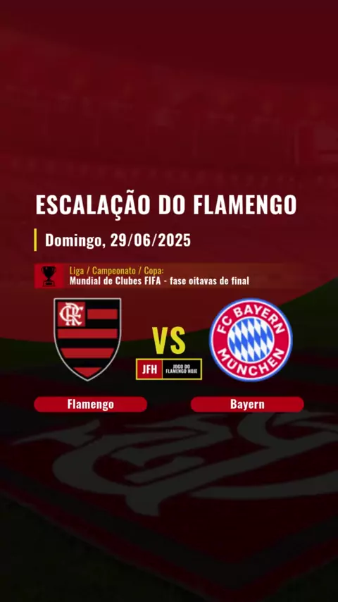 🔴⚫️ Escalação do FLAMENGO para o jogo contra o BAYERN DE MUNIQUE. Flamengo e Bayern de Munique se enfrentam às 17h (horário de Brasília) do domingo (29/06), no jogo da fase oitavas de final do Mundial de Clubes FIFA. 👥️🔔 Curta / siga este perfil. #EscalaçãoFlamengoxBayernDeMunique #EscalaçãoDoFlamengo #EscalaçãoJogoDoFlamengo #FlamengoxBayernDeMunique #Flamengo