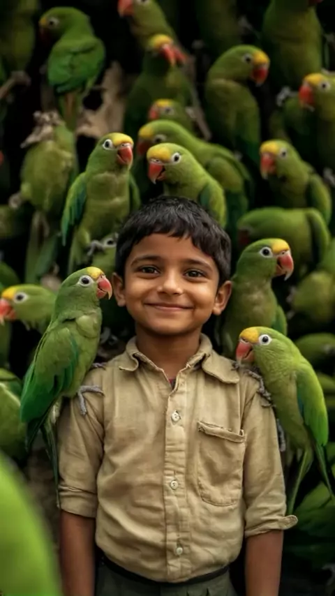 Os papagaios sussurram segredos ao vento, e a criança escuta com o coração, entre asas e risos, o mundo se pinta com cores de liberdade. 🧒🏽🦜🥰 #natureza #beleza #criança #papagaio #animais