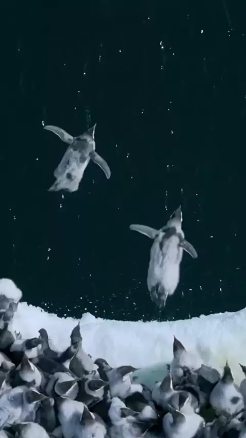 Do alto do penhasco, os pinguins se lançam ao mar, como estrelas caindo no abraço do gelo. 🐧🐧🐧 #natureza #animais #pinguins #mar #animais